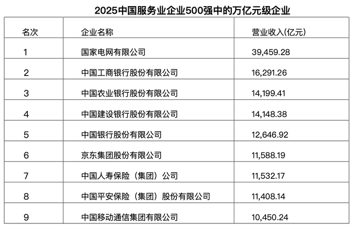 企均營收規(guī)模首次突破千億元級2025中國服務(wù)業(yè)企業(yè)500強的企均營收規(guī)模達到1022.24億元9家企業(yè)進入萬億元俱樂部,分別是國家電網(wǎng)、工商銀行、農(nóng)業(yè)銀行、建設(shè)銀行、中國銀行、京東集團、中國人壽、中國平安和中國移動。