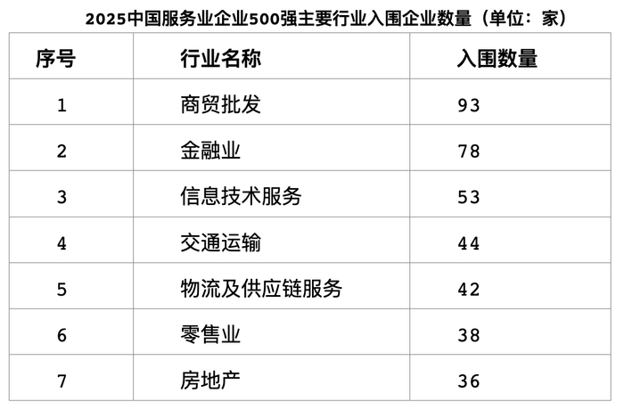 緊隨其后的還有交通運輸、物流及供應(yīng)鏈服務(wù)、零售業(yè)和房地產(chǎn),分別入圍44家、42家、38家和36家從整體結(jié)構(gòu)看,新興服務(wù)強勁崛起,傳統(tǒng)服務(wù)業(yè)穩(wěn)步轉(zhuǎn)型,服務(wù)業(yè)發(fā)展結(jié)構(gòu)不斷優(yōu)化2021-2025中國服務(wù)業(yè)企業(yè)500強中,傳統(tǒng)零售、房地產(chǎn)等領(lǐng)域深化調(diào)整,入圍數(shù)量分別減少11家和20家;物流及供應(yīng)鏈、互聯(lián)網(wǎng)及信息技術(shù)服務(wù)等現(xiàn)代新興服務(wù)業(yè)蓬勃發(fā)展,入圍數(shù)量分別增加3家和19家;特別是作為數(shù)字經(jīng)濟的關(guān)鍵支撐,信息技術(shù)服務(wù)業(yè)企業(yè)入圍數(shù)量達到53家。