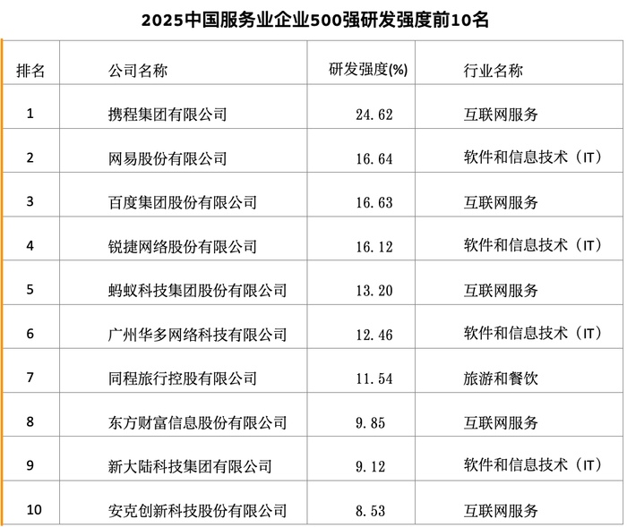 2025中國服務(wù)業(yè)企業(yè)500強研發(fā)強度前10名中有9家是信息技術(shù)服務(wù)業(yè)企業(yè),發(fā)明專利前10名中占7席。信息技術(shù)服務(wù)業(yè)企業(yè)已經(jīng)成為引領(lǐng)服務(wù)業(yè)創(chuàng)新突破的核心引擎。