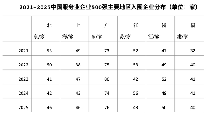 附圖:2021-2025中國服務(wù)業(yè)企業(yè)500強主要地區(qū)入圍企業(yè)分布(單位:家)