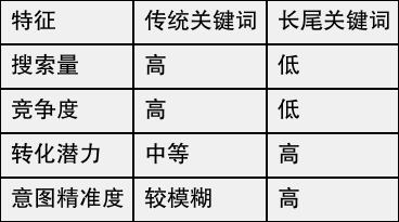 這種特性源于其聚焦細(xì)分場景,幫助網(wǎng)站吸引高意向流量為清晰展示差異,以下是長尾關(guān)鍵詞與傳統(tǒng)關(guān)鍵詞的關(guān)鍵特征對比: