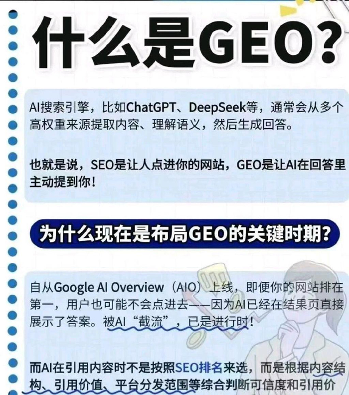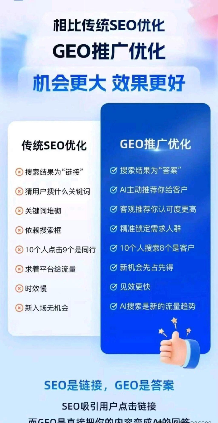 為什么現(xiàn)在要做GEO,信陽 AI搜索是頭牛頭牛未來,更是公司現(xiàn)在! 用戶越來越懶,信陽直接問AI助手:“上海哪家小龍蝦口味好?”“上海哪家月子中心性價比高,“你的品牌能被推薦嗎? 從被動等待用戶發(fā)現(xiàn),到主動為用戶創(chuàng)造體驗 —— 這是傳統(tǒng)搜索與 AI 搜索的核心差異。